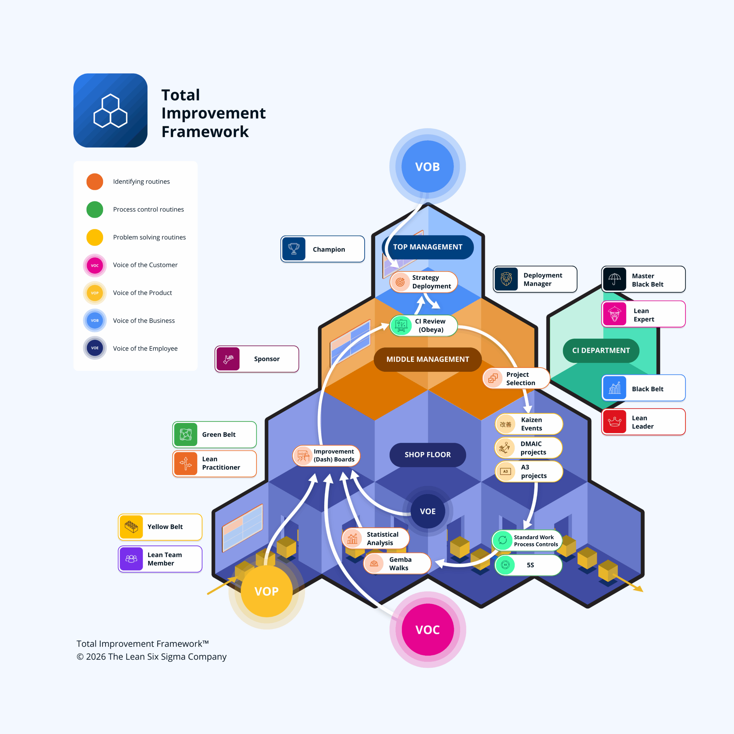 Le Total Improvement Framework (TIF) est notre approche unique pour ancrer l’amélioration continue à tous les niveaux d’une organisation. Basé sur les principes du Lean Six Sigma, il offre une structure évolutive pour développer les compétences, aligner les efforts et créer des routines qui rendent l’amélioration active et durable.