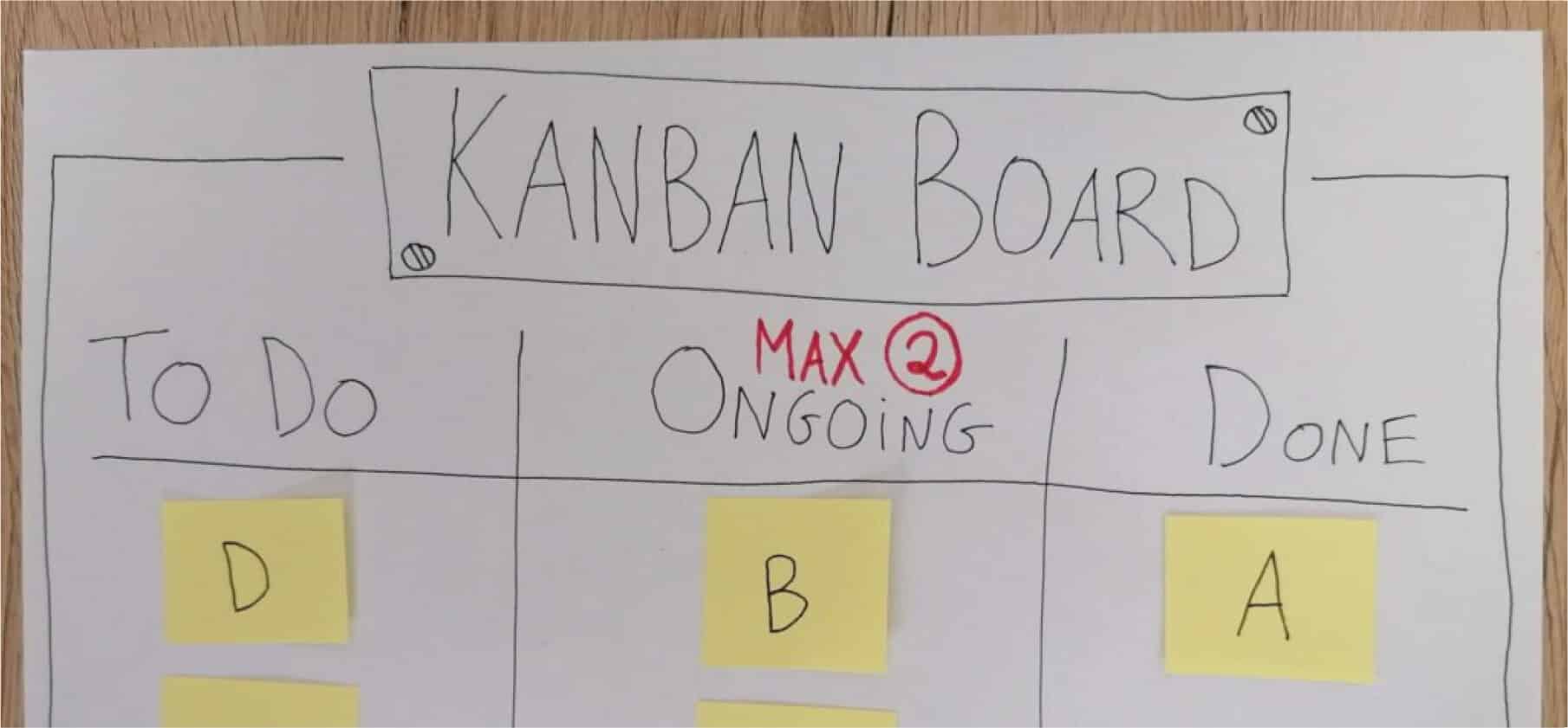 Nu kan je een pull-systeem creëren door een maximum te kleven op het aantal taken dat ‘In Progress’ kan zijn. Kies je bijvoorbeeld om gelijktijdig maximum aan twee taken te werken, kan je nu uit je ‘Backlog’ twee taken kiezen die absolute prioriteit krijgen. Deze taken kleef je in de tweede kolom en ga je vervolgens aan werken. Eenmaal een taak is afgewerkt, kleef je de post-it in de derde kolom. Hierdoor heb je terug plaats in de tweede kolom want daar mogen er maximum twee taken kleven. Je kiest opnieuw een taak uit de eerste kolom waar je nu aan gaat werken en kleeft deze taak in de tweede kolom, enzoverder.