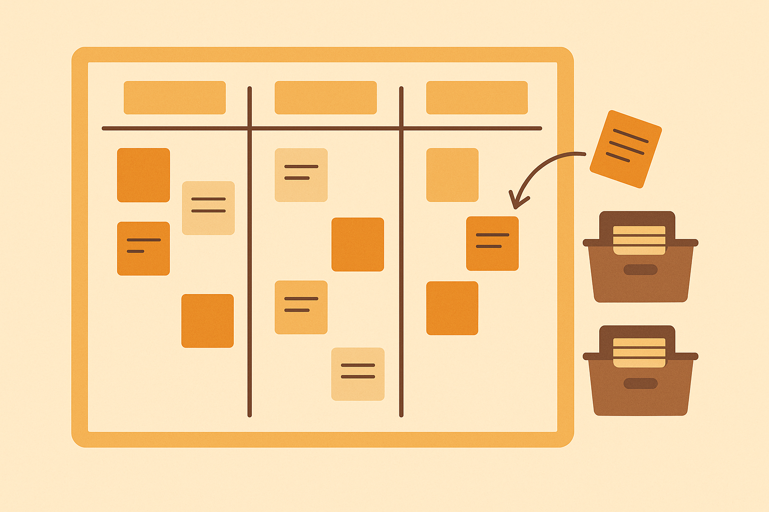 Kanban can be cast in various forms, one of which is the ‘kanban board’. This is a variation on the kanban cards. On a board Post-It notes, magnets and cards are used to provide an overview of the amount of work and the number of tasks which have to be carried out. Every card represents a product or service in a process and the movement on the board shows the movement in that process. The board is often divided into three columns: ‘waiting for production’, ‘in production’ and ‘produced’.